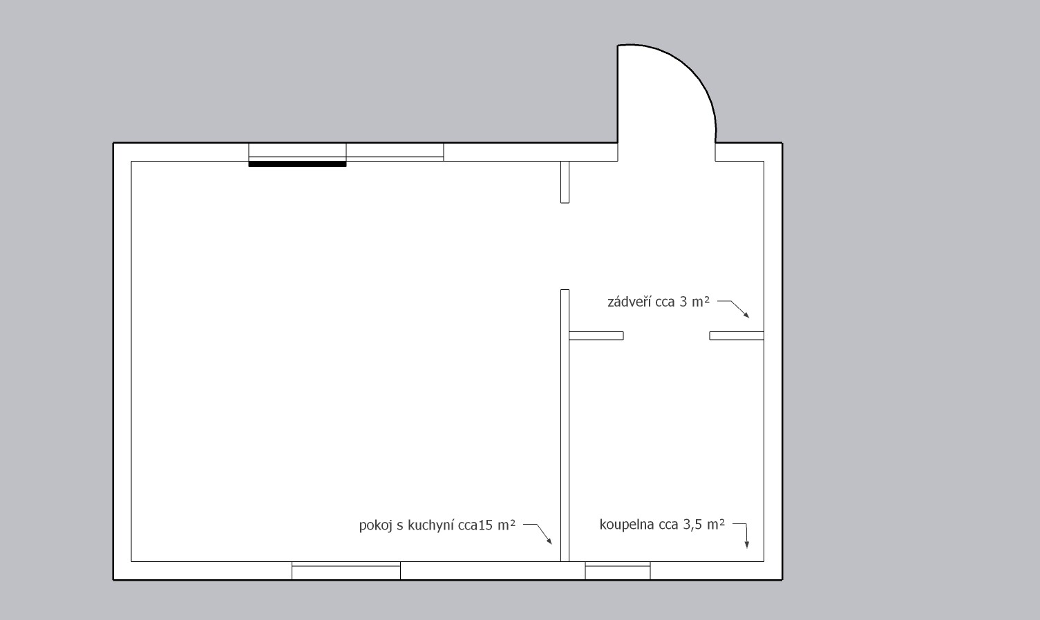 Rozvržení: obývací pokoj s kuchyňským koutem, koupelna, WC
