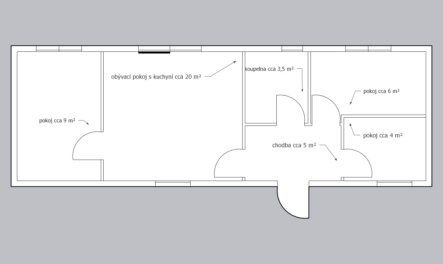 | Rozvržení: | 3 pokoje, bývací pokoj s kuchyňským koutem, koupelna, WC |