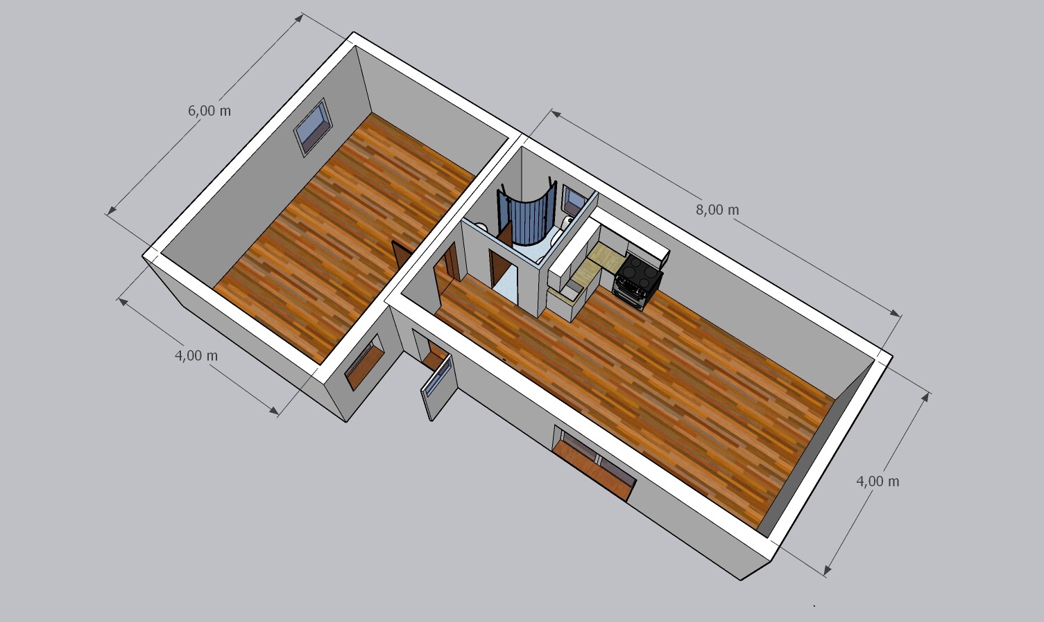 | Výbava: | 2 nové mobilheimy, zkolaudovatelné, fasádní lepidlo, výška stropu v celém mobilheimu 2,5 m, rovný strop, vnitřní stěny sádrokarton, dřevěný strop, podlaha zátěžové lino, kuchyně (dřez, digestoř, varná deska s troubou), koupelna (WC, umyvadlo, sprchový box, bojler 80l), síla vnějších stěn cca 24 cm (minerální vata + polystyren), podlahy cca 18 cm (minerální vata), střechy cca 32 cm (minerální vata), výroba střechy probíhá na místě po uložení s libovolným sklonem |