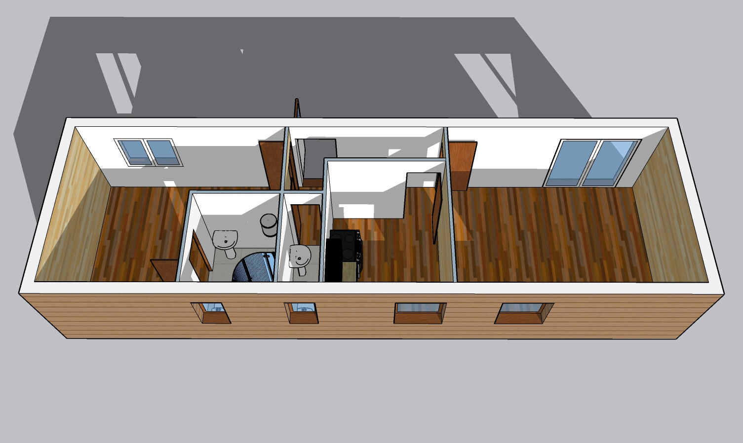 | Výbava: | Nový mobilheim, dřevěný obklad, vnitřní stěny sádrokarton a dřevěný obklad, strop dřevěný obklad, kuchyně, (dřez, digestoř, varná deska s troubou), koupelna (WC, umyvadlo, sprchový box, bojler 80l), malá koupelna (WC, umyvadlo) |