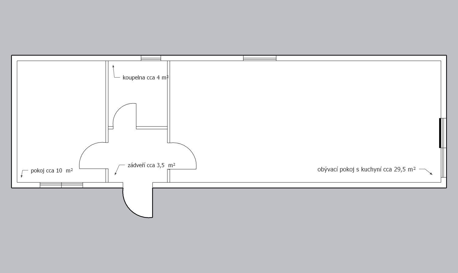 Rozvržení: 1 ložnice, obývací pokoj s kuchyňským koutem, koupelna, WC