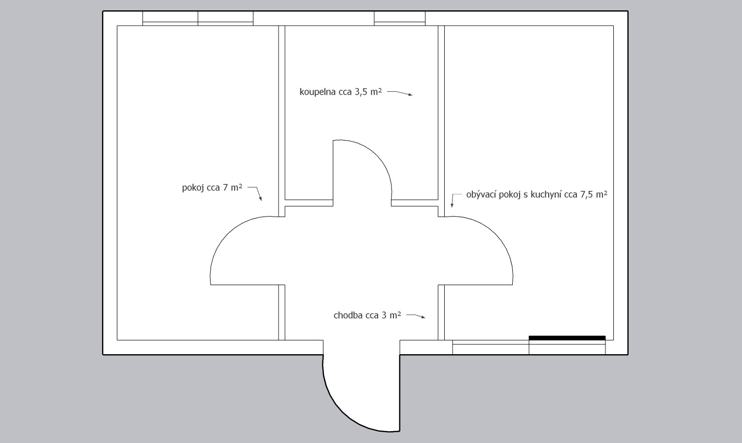 | Rozvržení: | 1 ložnice, obývací pokoj s kuchyňským koutem, koupelna, WC |