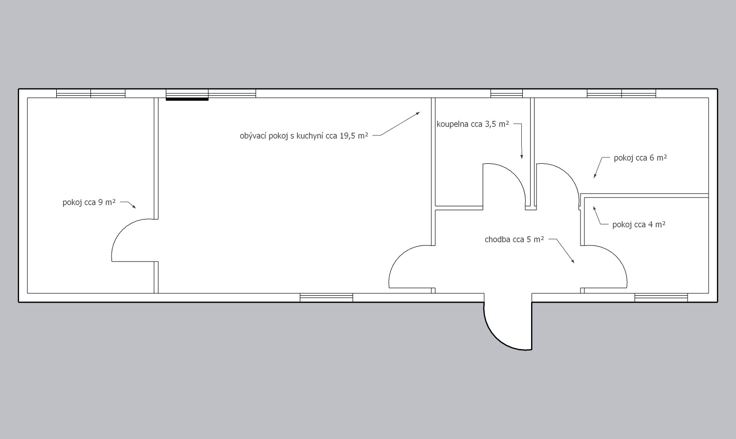 | Rozměry: | 13,39 x 4,19 (cca 56m2) |