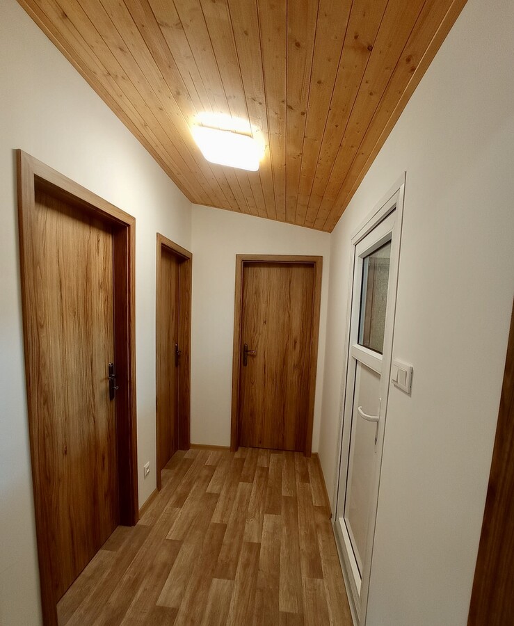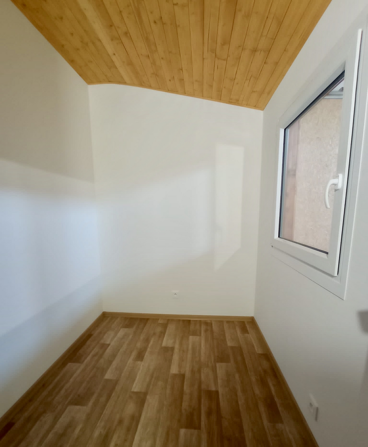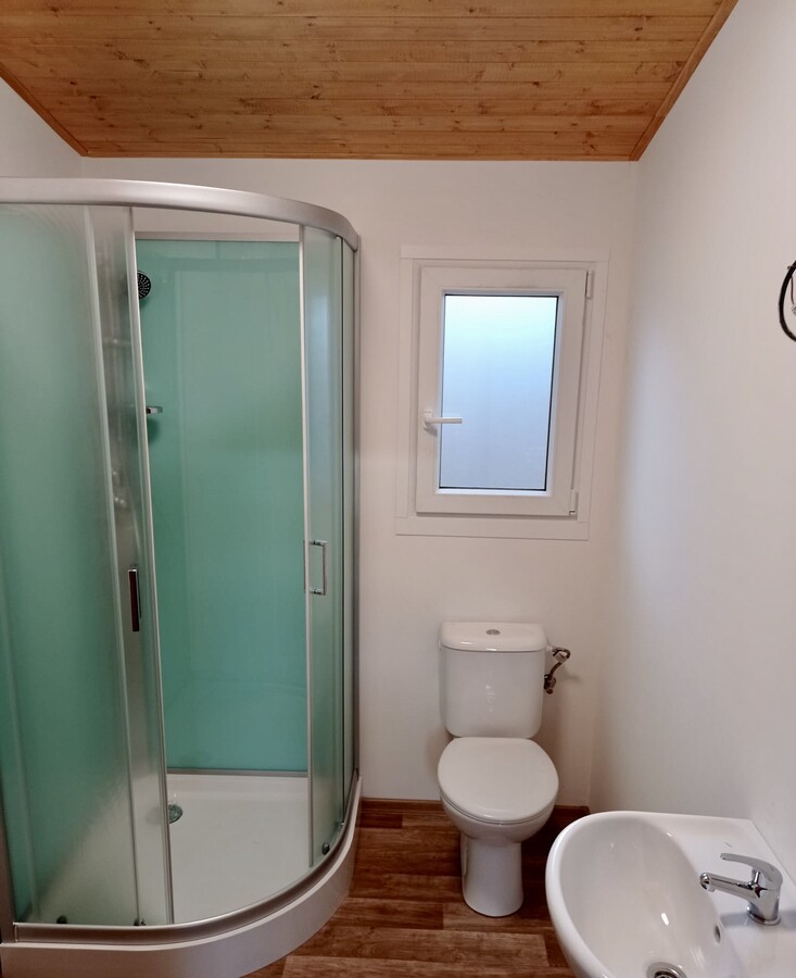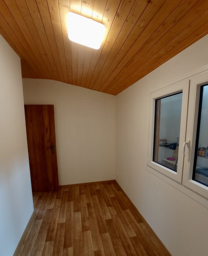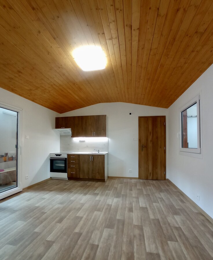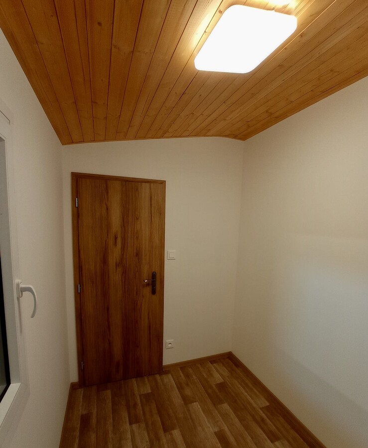 | Výbava: | Nový mobilheim, dřevěný obklad, vnitřní stěny sádrokarton, strop dřevěný obklad, podlaha zátěžové lino, kuchyně (dřez, digestoř, varná deska s troubou), koupelna (WC, umyvadlo, sprchový box, bojler 80l), síla vnějších stěn cca 17 cm (minerální vata), podlahy cca 15 cm (minerální vata), střechy cca 24 cm (minerální vata) |