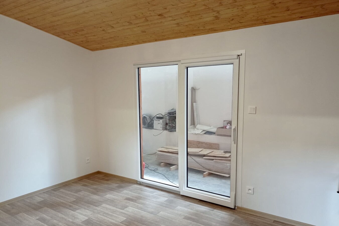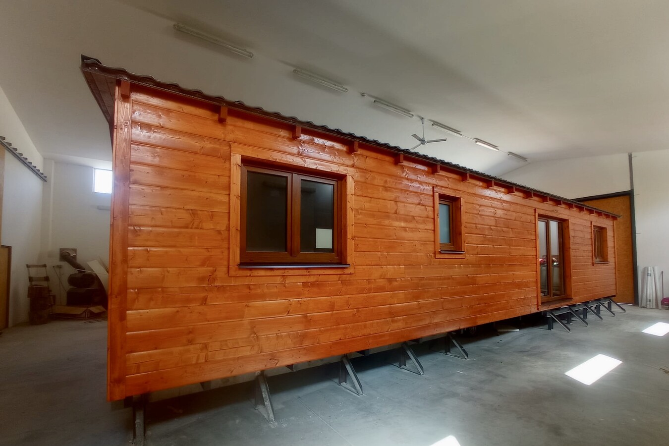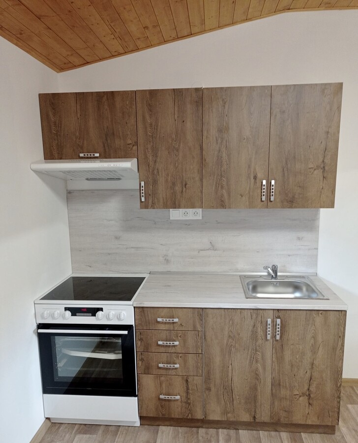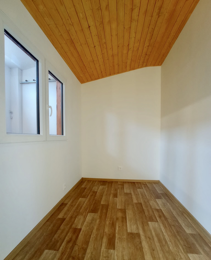 | Výbava: | Nový mobilheim, dřevěný obklad, vnitřní stěny sádrokarton, strop dřevěný obklad, podlaha zátěžové lino, kuchyně (dřez, digestoř, varná deska s troubou), koupelna (WC, umyvadlo, sprchový box, bojler 80l), síla vnějších stěn cca 17 cm (minerální vata), podlahy cca 15 cm (minerální vata), střechy cca 24 cm (minerální vata) |